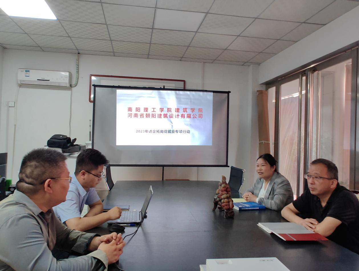 本网讯 针对今年严峻的就业形势,本着"内抓教育,外拓市场、全员参与”的原则和"早起步、早准备、早动手"的策略,我院积极、有针对的拓宽就业途径,千方百计提高就业率和就业质量。近日来,通过积极开展访企拓岗促就业专项行动,学院领导班子分赴北京、武汉、成都等城市,先后与十余家企业进行深入交流,达成就业实习初步意向。 6月5日,建筑学院院长谭征、副书记张辉一行赴河南省朝阳建筑设计有限公司开展“访企拓岗促就业”专项行动。