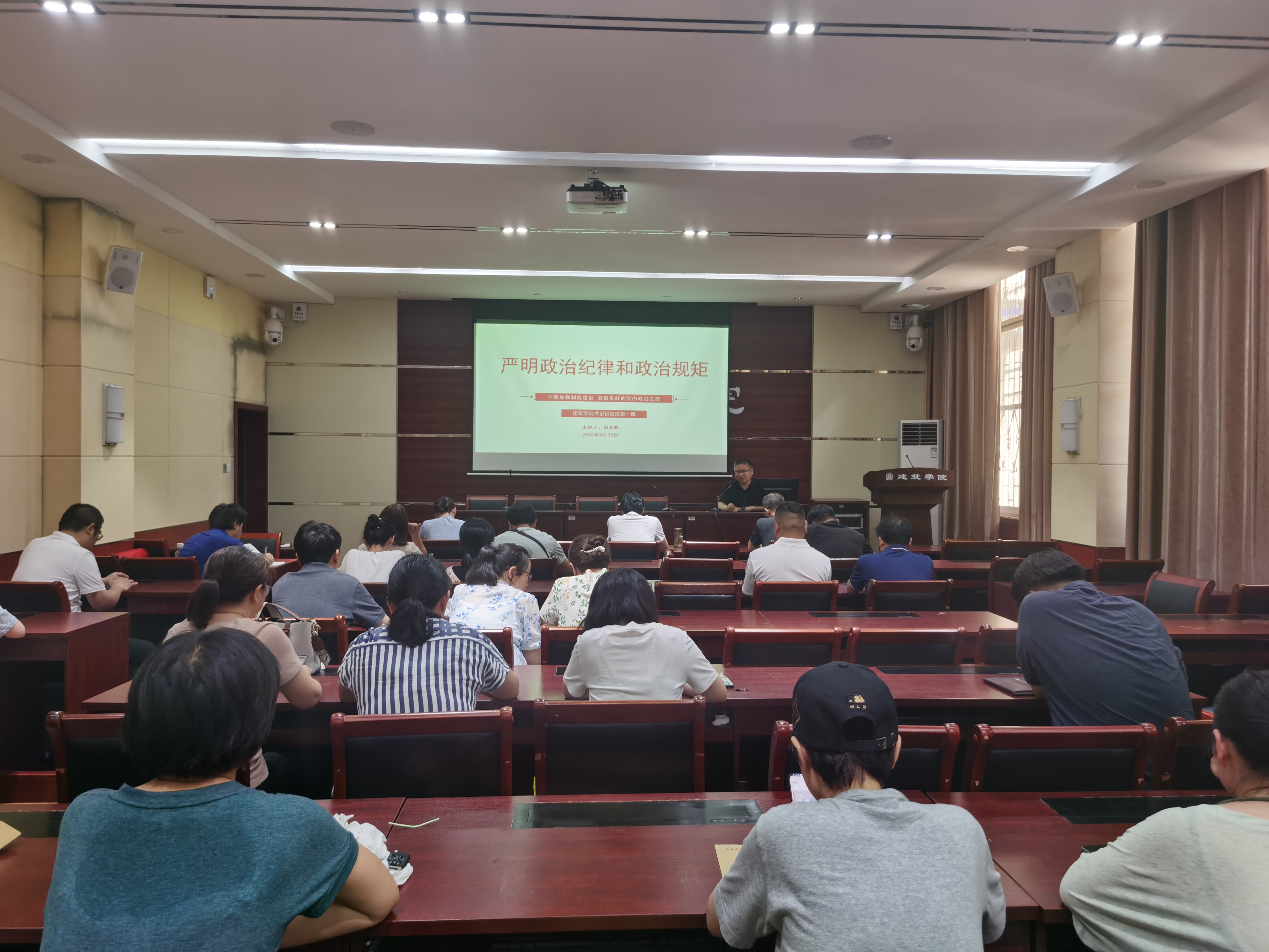 本网讯(学生记者/王晨) 为积极响应校党委《关于在全校党员干部中开展“明方向、立规矩、正风气、强免疫”专题纪律教育的工作方案)的通知》和《关于开展庆“七一”“学思想、强党性、重实践、建新功”系列活动》等文件精神,6月25日下午,建筑学院“书记讲纪法”第一课于7106多功能报告厅举行。