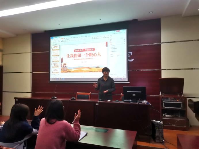 张院长从浅谈世界粮食日出发,引出“齐成长,同繁荣,共持续”的习近平新时代中国特色社会主义思想。她重点强调了四点内容:一是每个人都要有“节约粮食,从我做起”的意识;二是要怀有危机意识,保“大国粮仓”;三是筑长效机制,杜绝“舌尖上的浪费”,要重视法律的作用,通过立法的方法建立长效机制,抵制浪费行为;四是兴节约之风,将传统美德宣传好、落实好。张院长结合实例,联系当前时事,用深入浅出的话语给大家上了生动的一课。她强调“厉行节约,反对浪费”重在建立诚信机制,形成完整的治理体系,发挥全面的治理能力。