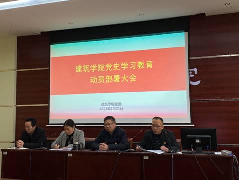 (通讯员 杨菲 田真)3月23日下午,建筑学院在7106召开党史学习教育动员部署大会,深入贯彻学习习近平总书记在党史学习教育动员大会上的重要讲话精神,并就学院开展党史学习教育进行全面动员部署。学院党委领导班子全体成员出席会议,院党委书记田光辉、副书记张辉做动员讲话。会议由学院副院长谭征主持,全体师生党员参会。