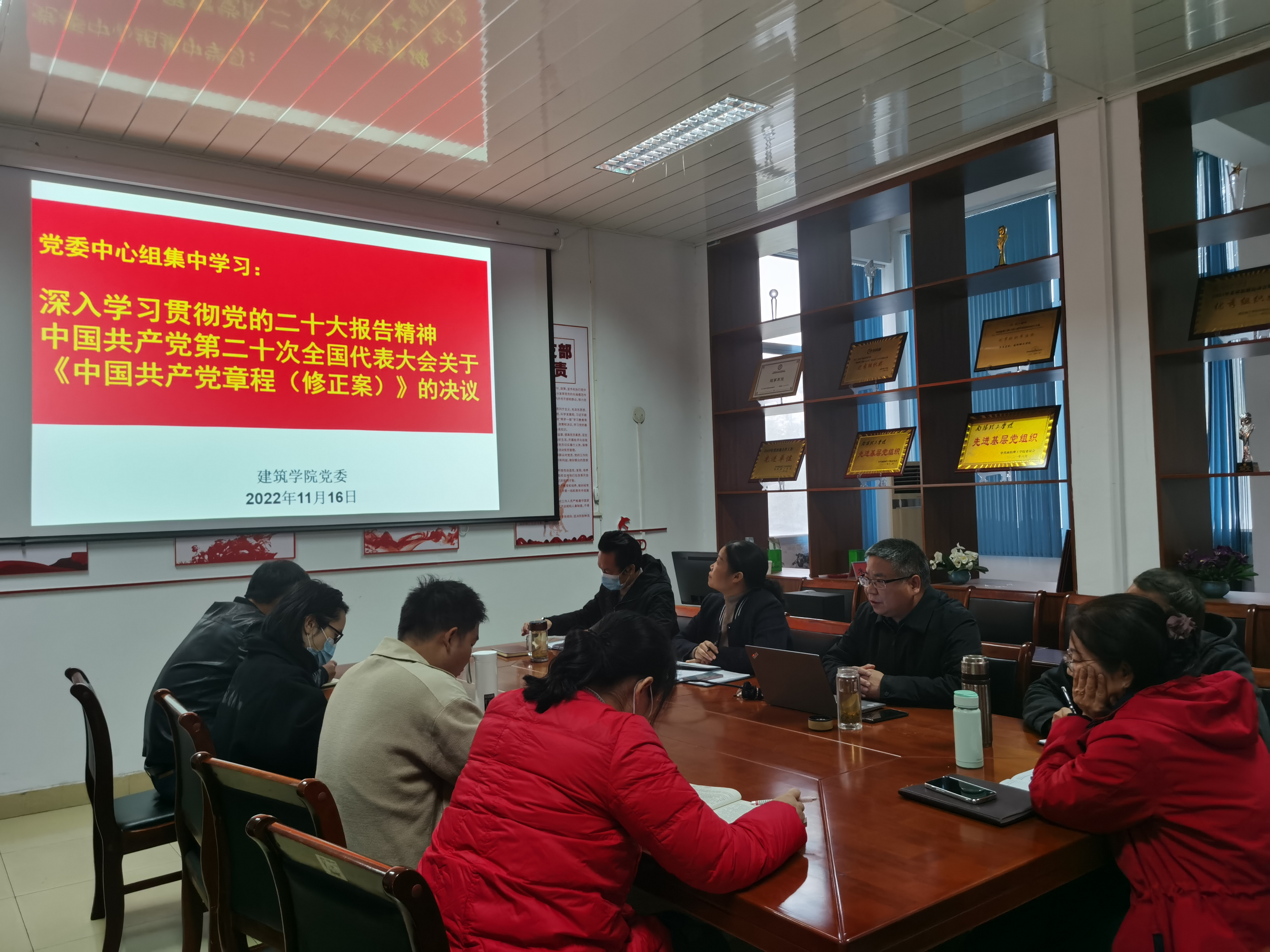11月16日,建筑学院召开理论学习中心组(扩大)学习会,传达学习党的二十大精神。会议由党委书记田光辉主持,党委领导班子、各党支部书记参会。