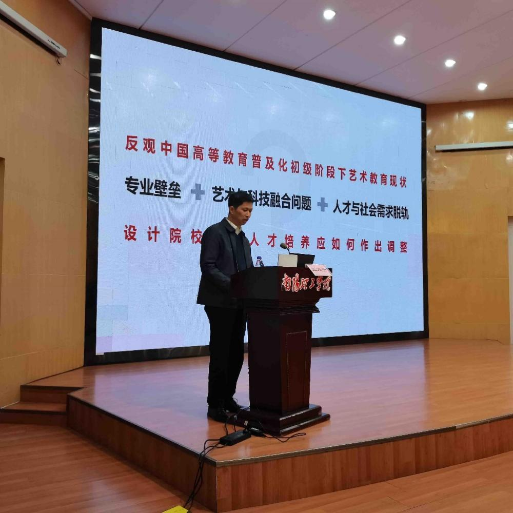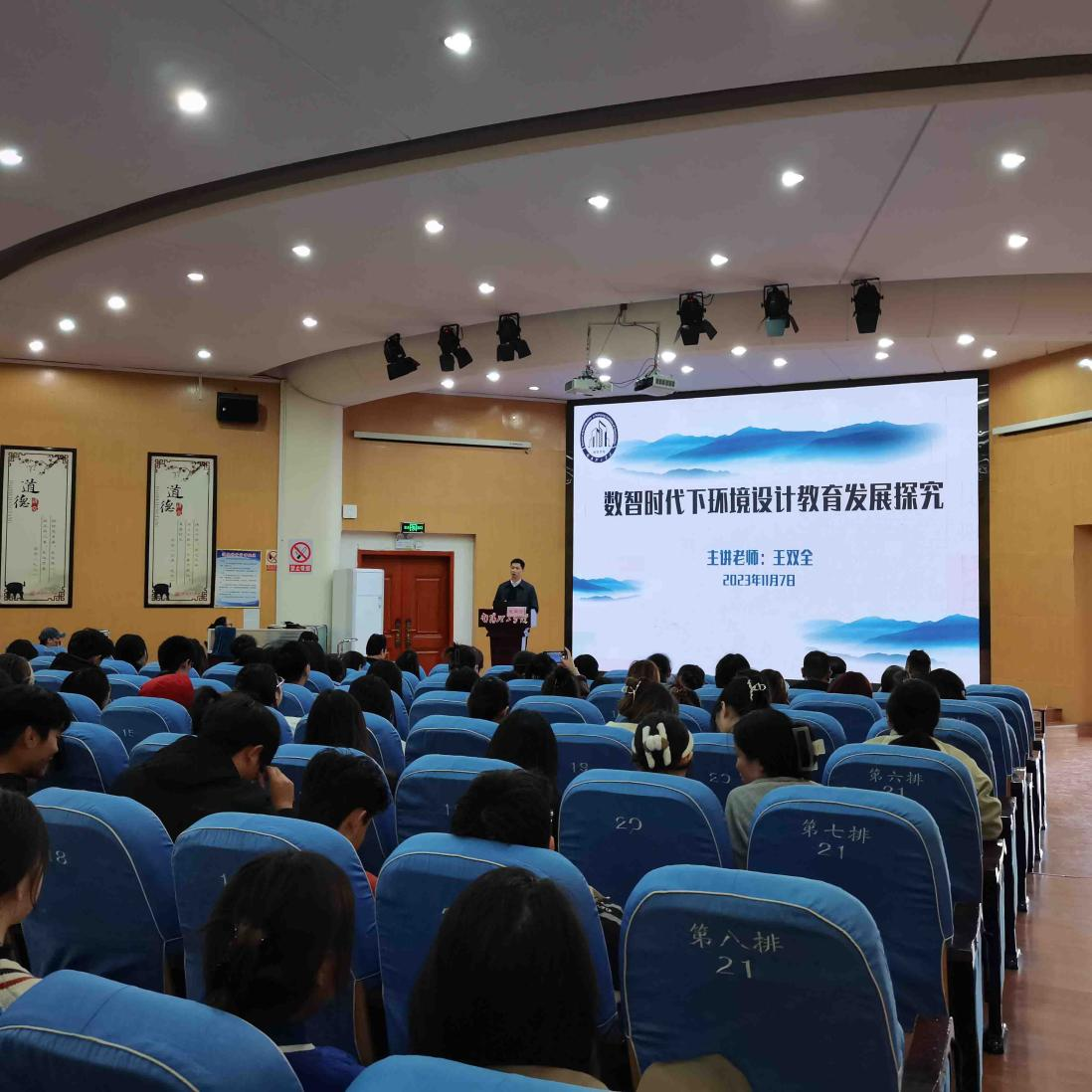 本网讯 11月7日下午,武汉理工大学艺术设计学院博士生导师王双全教授应邀在我校领创空间二楼学术报告厅开展学术讲座。讲座主题为“数智时代下环境设计教育发展探究”,建筑学院副院长赵敬辛担任主持,近200多名师生参加。