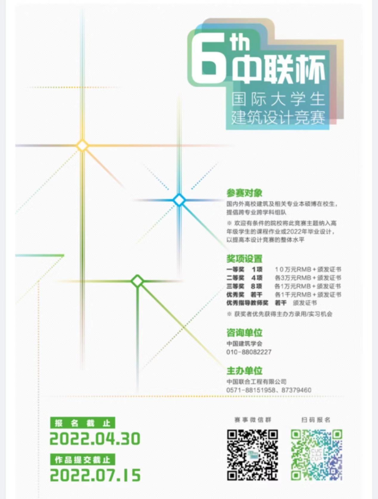 作品提交截止时间:2022年7月15日请将参赛作品图板及光盘邮寄至中国联合工程有限公司地址:浙江省杭州市滨江区滨安路1060号中国联合工程有限公司※ 欢迎各大高校以院系为单位或以个人、小组为单位的方式进行报名。参赛人必须按本通知时间要求填写参赛报名回执表,报名后应按时提交参赛方案。本次竞赛免交报名费。