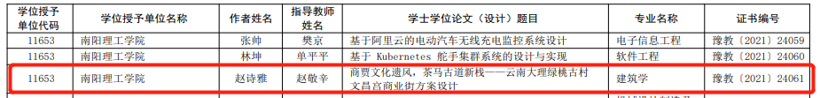 近日,河南省教育厅河南省学位委员会公布了《河南省教育厅河南省学位委员会关于批准2020年河南省优秀学位论文的决定》(教研〔2021〕254号)。我院2020届建筑学院专业学生赵诗雅的本科学位论文《商贾文化遗风,茶马古道新栈——云南大理绿桃古村文昌宫商业街方案设计》获得2022年河南省优秀学士学位论文,指导教师赵敬辛获得2020年度河南省优秀学位论文指导老师。