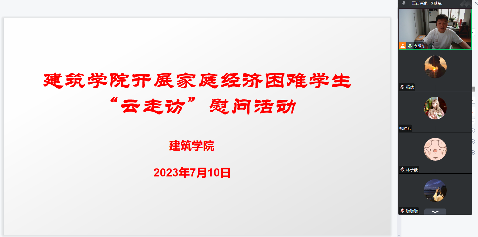 7月10日,建筑学院开展了家庭经济困难学生“云走访”慰问活动。走访过程中,老师们就学生近期在家的思想、学习、生活状况和遇到的困难进行了详细的了解,并建议同学们在家要规律生活,不忘学习,合理规划假期生活。随后,学院资助专干李明东老师宣讲了国家和学校的各项资助政策。