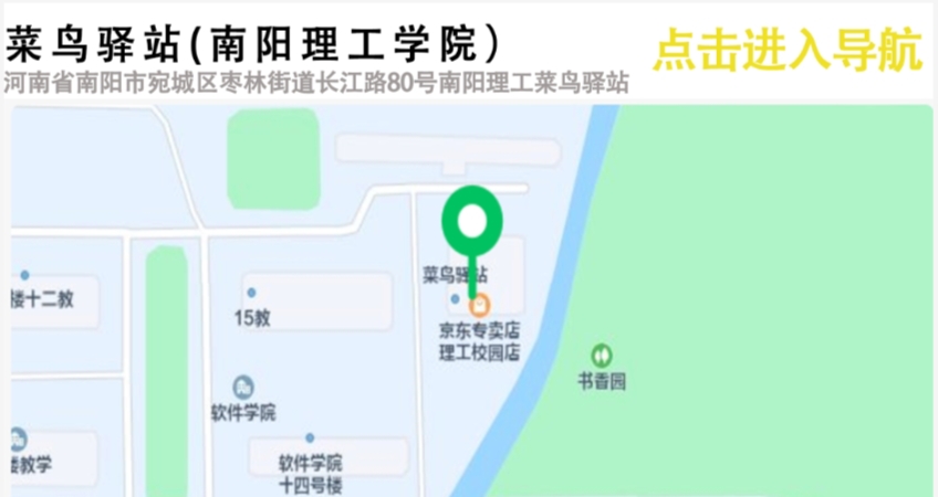 地址:南阳市宛城区枣林街道长江路80号南阳理工软件学院隔壁菜鸟驿站