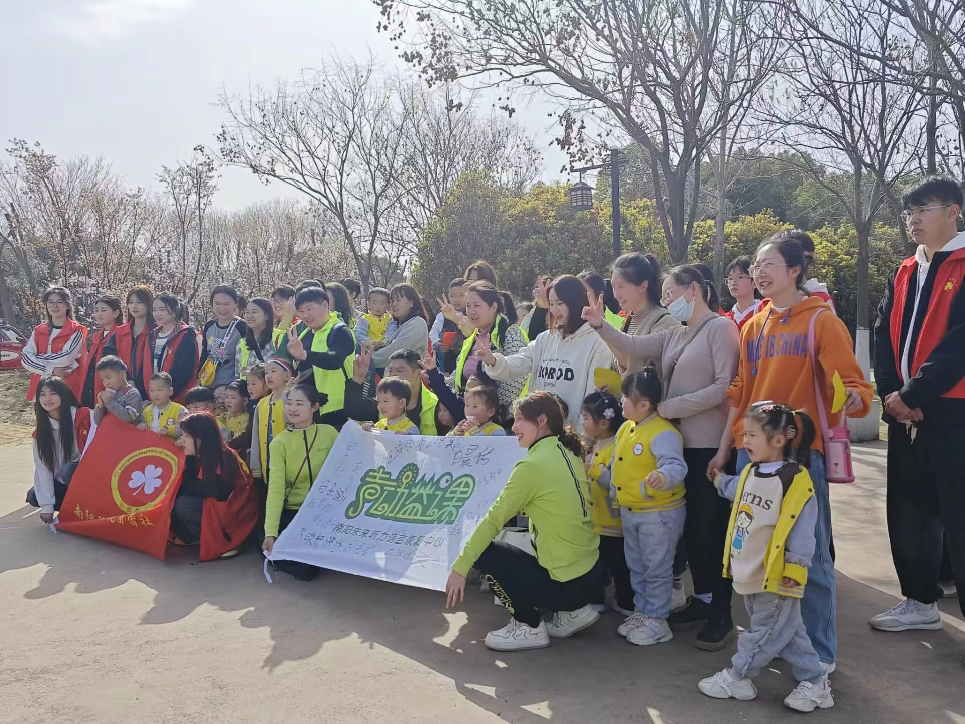 本网讯(学生记者/刘欣琪)3月20日,南阳未来听力语言康复中心协同我院苜蓿社于梅城公园联合举办“我与春天的约会”志愿活动。苜蓿社15名志愿者及康复中心的儿童、家长和老师参加本次活动。