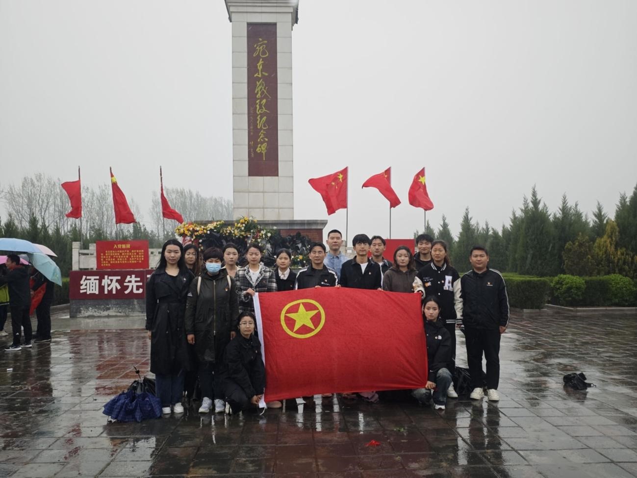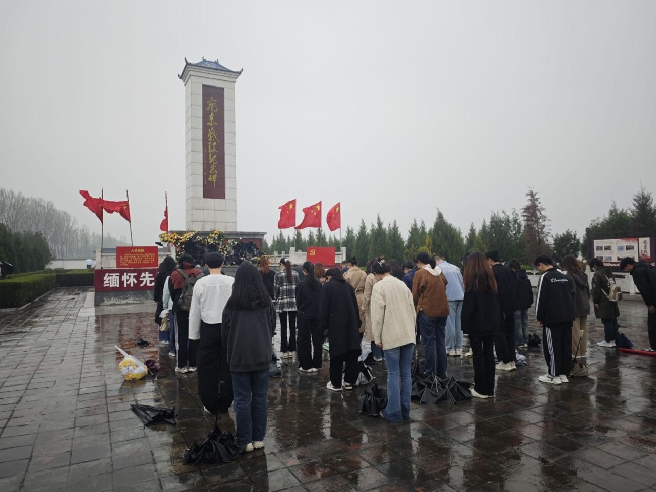 烈士陵园庄严肃穆,青松翠柏挺拔苍劲,鲜艳的五星红旗高高飘扬。在活动现场,建筑学院受助学生整齐排列,手持鲜花,面向烈士纪念碑,在雨中向英勇献身的先烈们进行默哀。