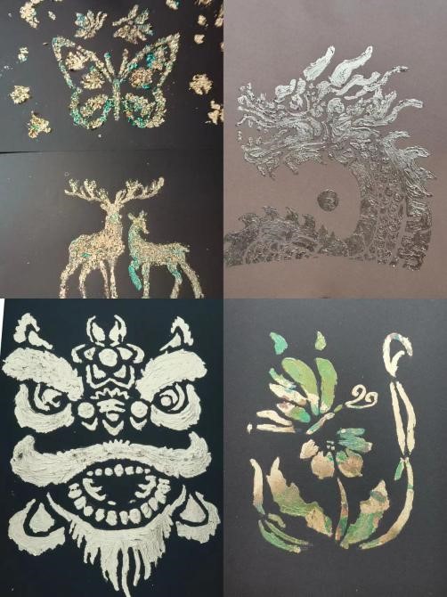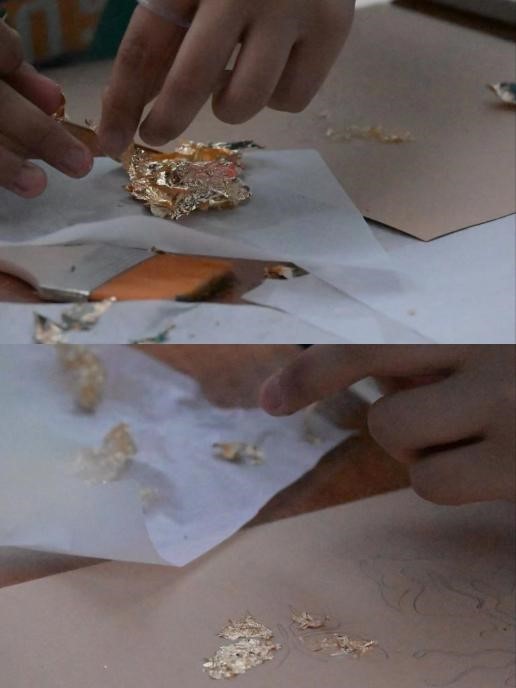 烧箔画的制作分为四个步骤:“画”“涂”“贴”“扫”,在社团成员的指导下,同学们将自己喜欢的模板刻在纸上,小心翼翼地涂上胶水、贴上烧箔,再用毛刷抚平表面,随后压实、清扫多余的箔料,沉浸体验了这项非遗手艺。