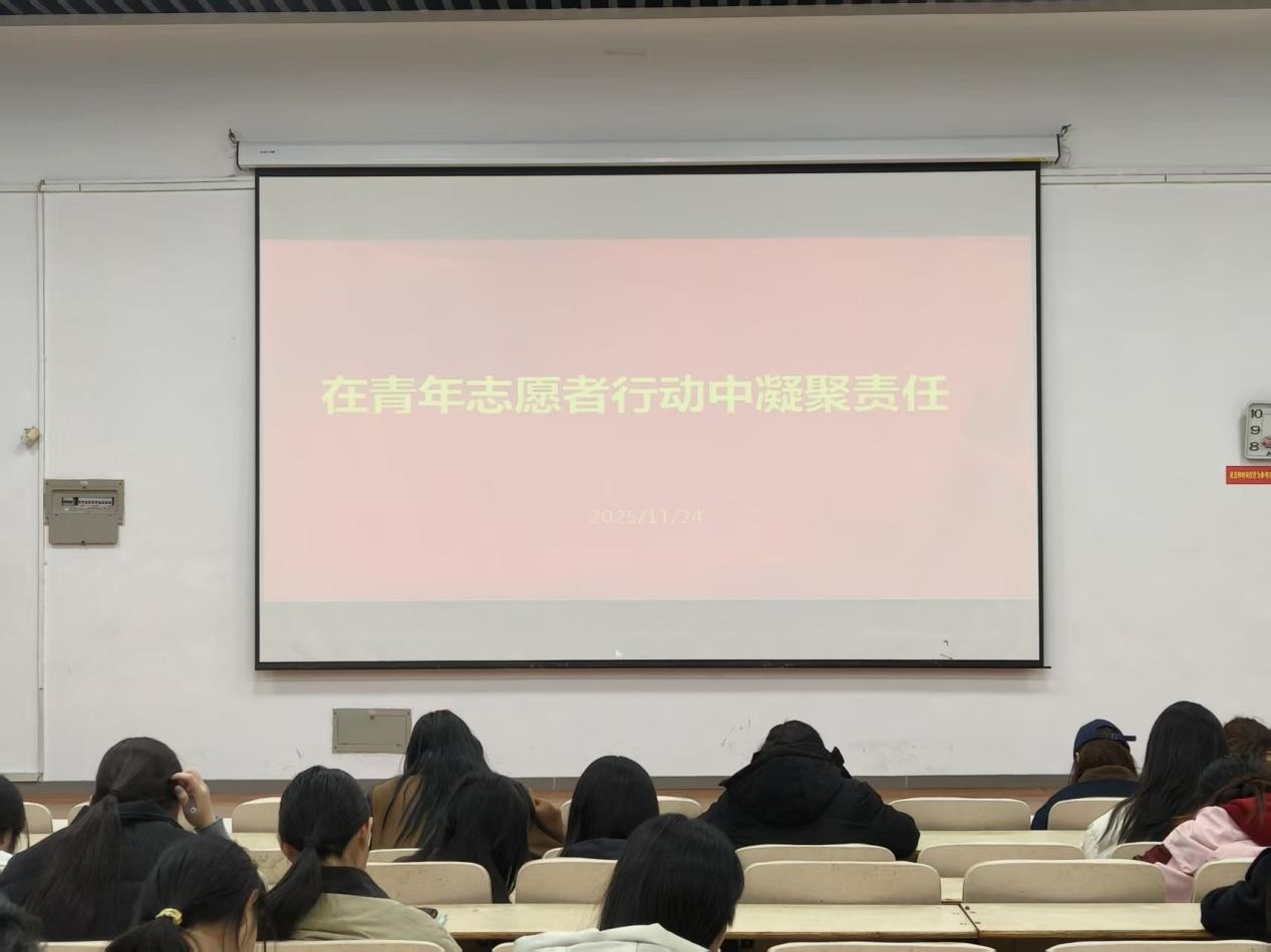 课堂上,张梦圆通过展示我校青年志愿者服务足迹的短片,带同学们回顾从社区服务到活动保障、从环保到扶贫助残的瞬间,展现了“奉献、友爱、互助、进步”的志愿精神。随后,她从“新时代青年责任”切入,阐述青年志愿者行动不仅是服务社会、帮助他人的平台,更是青年锤炼品格、增长才干、凝聚担当的实践课堂。她用案例引导同学们思考如何将个人成长融入国家发展、将“责任”内化为青春追求。