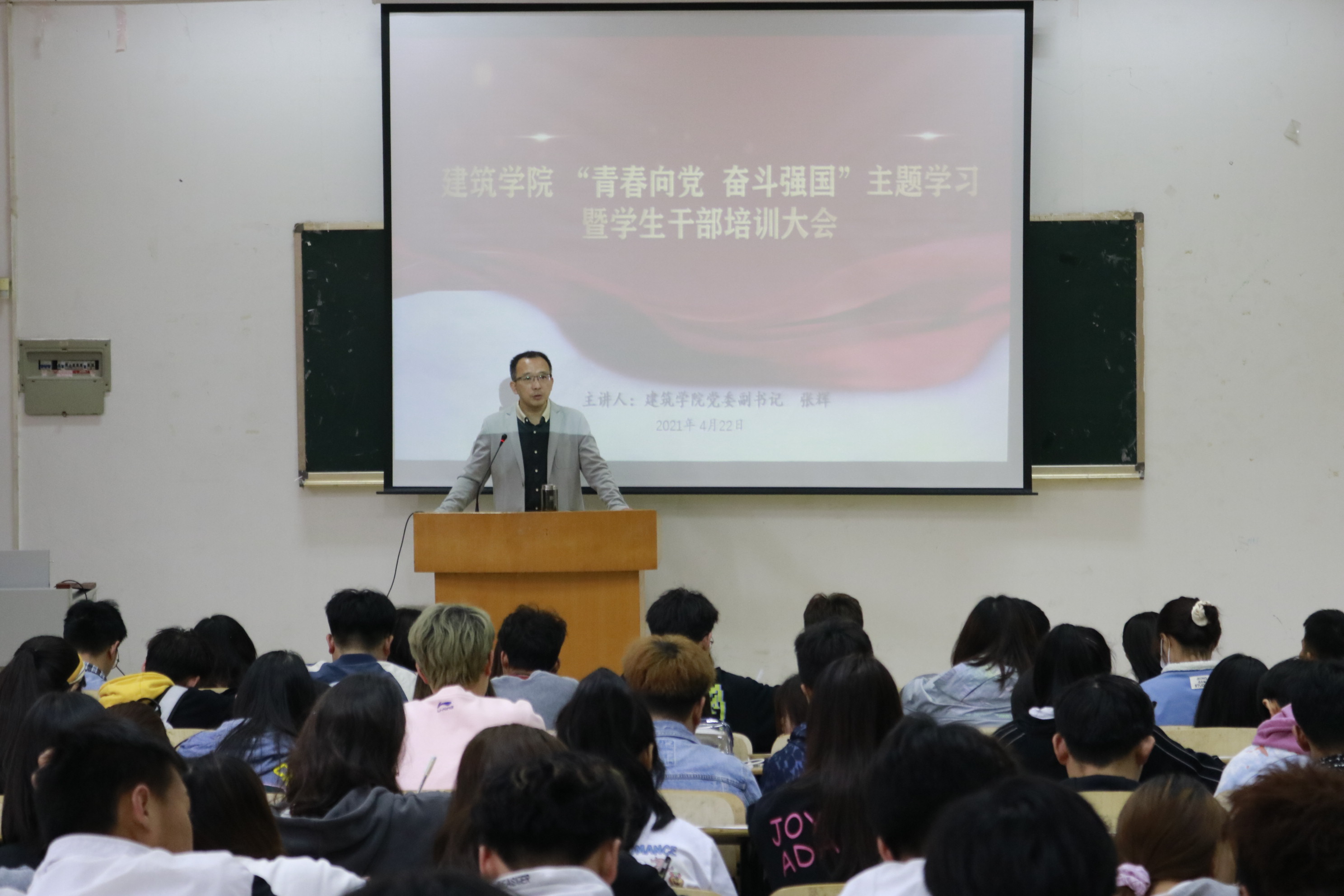 本网讯(特约记者/李延克学生记者/张珂晴)为引导我院学子深入贯彻学习习近平新时代中国特色社会主义思想,进一步加强建筑学院学生干部队伍建设,4月22日,建筑学院举办了“青春向党,奋斗强国”主题学习暨学生干部培训大会。建筑学院党委副书记张辉主持,团学办全体老师、学生组织全体成员、各班班长团支书参加本次培训。
