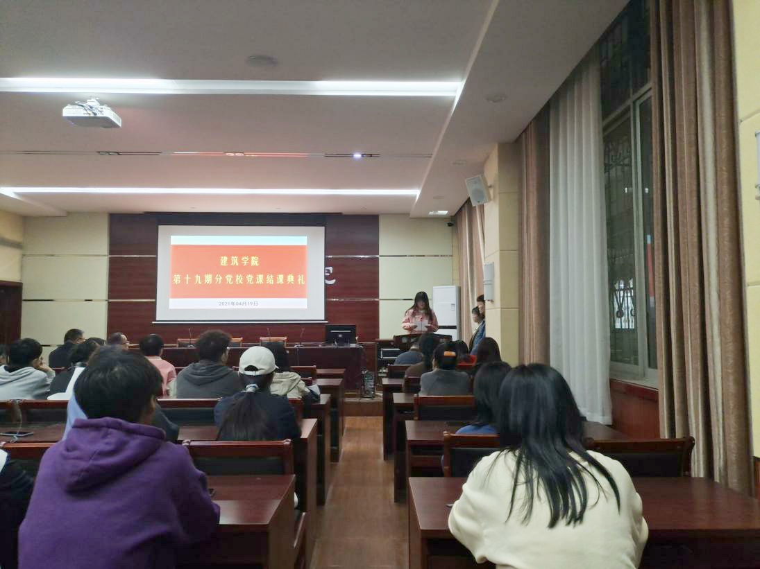 本网讯(学生记者/何梦媛)4月19日晚,建筑学院在七教106举办第十九期分党校党课结业典礼。建筑学院党委书记田光辉、党委副书记张辉 、党委组织委员杨菲、第二学生支部书记余淑君、 第三学生支部书记李明东出席本次结业典礼,第十九期的入党积极分子到场参加。