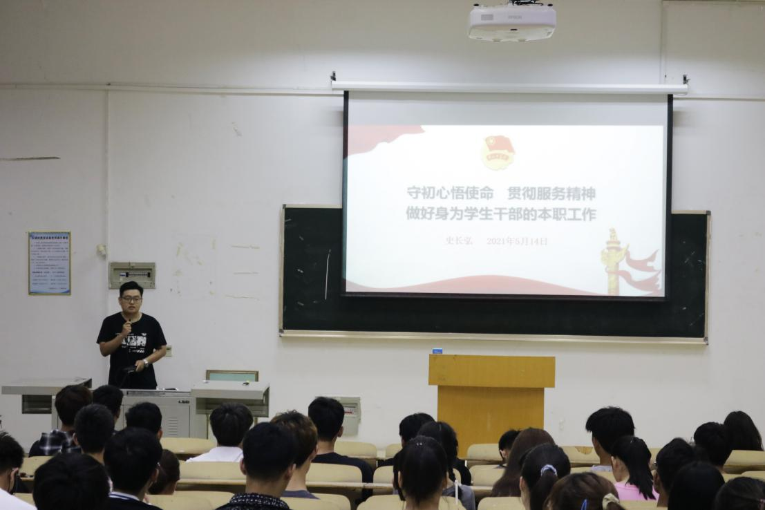会议上,史长弘同学首先从“什么是学生干部”、“怎样做好学生干部”、“做学生干部能得到什么”、“怎样统筹学习生活工作三者关系及如何配合好老师做好各项工作的执行”、“推进、反馈与总结”五点出发,和学生组织全体成员交流了自己的工作经验。随后,他提到“热情大过于能力”这一观点,对工作保持热情能更好的提升工作能力,要保证学生组织充满活力,这一点正是当下学生组织所需要具备的。最后,史长弘同学结合自身的学习经验和工作经验为同学们解答了“学习、生活、工作如何兼顾”这一问题。他重点强调了学习和工作时要有高效率和计划性,调整生活重心,合理规划自己的时间,抓住课余间隙来完成课业和工作。