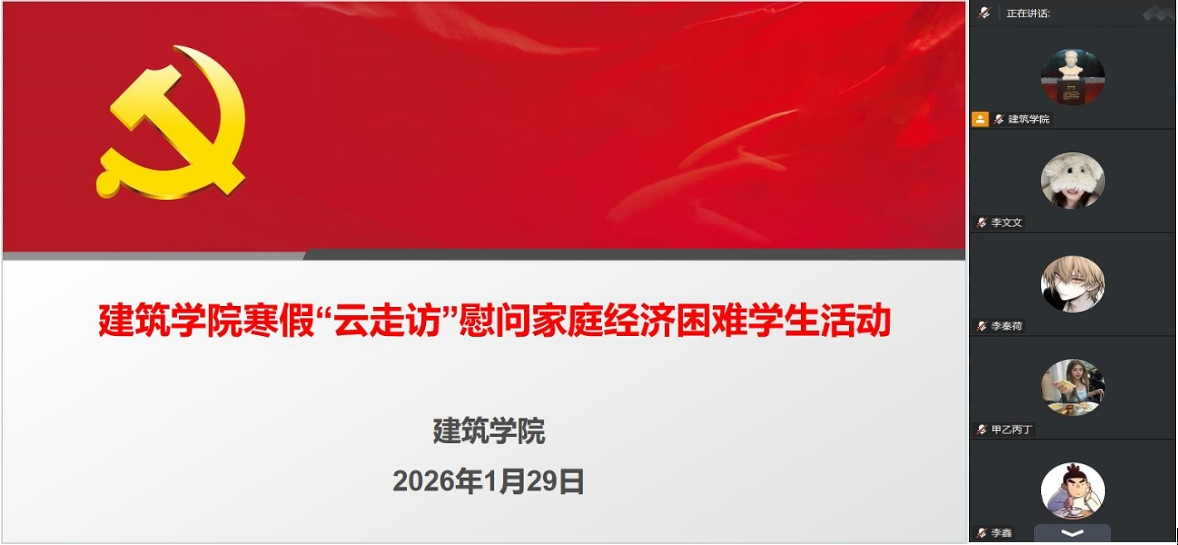 此次线上走访,是建筑学院落实资助育人、加强家校联动的重要举措。未来,学院将继续完善“线上沟通”与“线下走访”相结合的常态化关怀机制,切实助力每一位学子成长成才,实现梦想。(校对/李明东 审核/田真)
