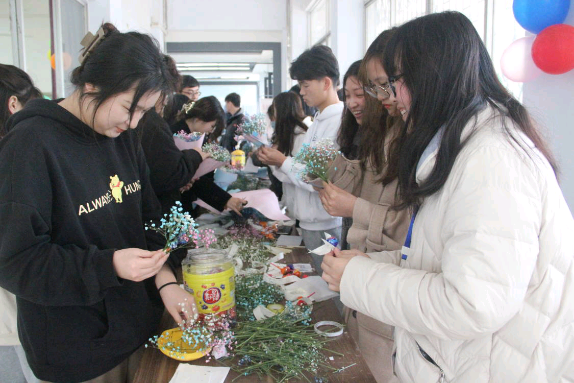 活动现场,不同班级的同学随机打乱成组,在7教101教室进行了你画我猜、击鼓传花、抓鸭子、成语接龙等游戏,这不仅考验了各组成员的反应能力和成语水平,还增强了彼此的默契,提升了活动趣味性。在插花环节,同学们选择心仪的花朵、糖果进行制作,并组合成花束。看着自己亲手创作的插花作品,大家充满了成就感与喜悦感,纷纷拿出手机记录下这美好时刻。包装好的花朵也承载着深深的祝福被同学们送给了亲近的人,既传递了美好的愿景,也紧扣了“送你一朵小红花”的活动主题。