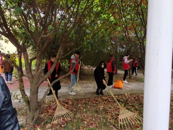 活动现场,志愿者们身着红马甲,手拿铁夹、扫帚、簸箕打扫草坪,对林间小路及绿化带内的杂物进行清理,大家分工有序,劳动热情高涨,活动开展得如火如荼、秩序井然。