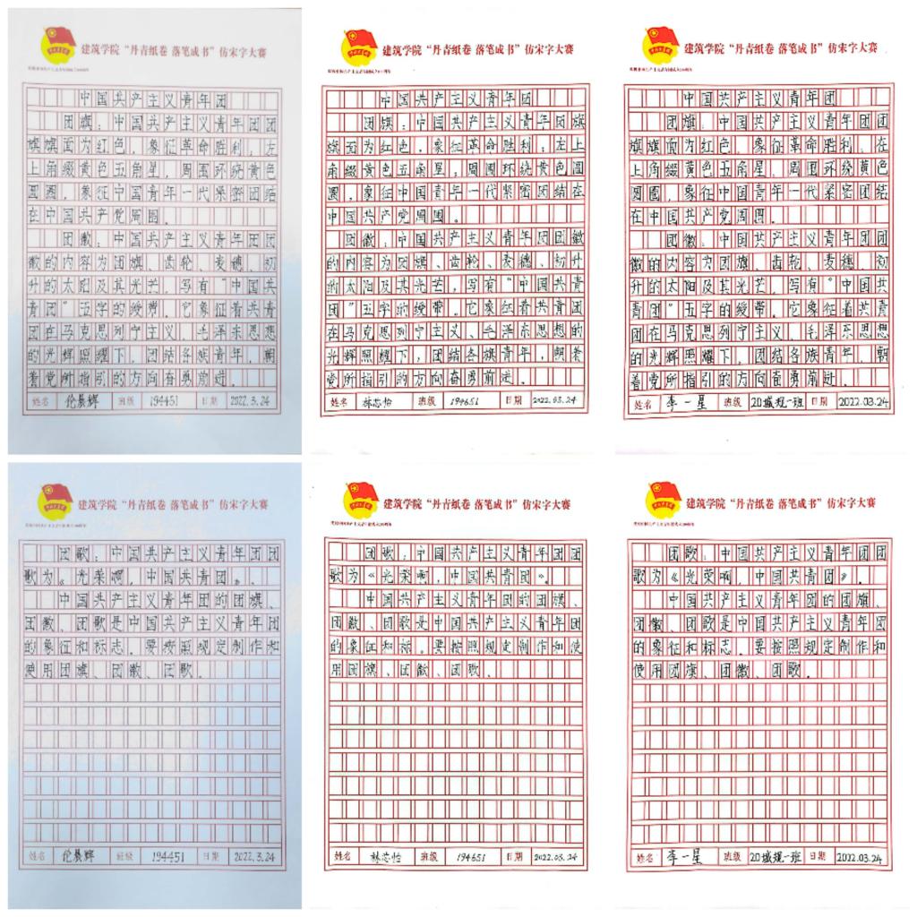 此次仿宋字比赛,旨在为中国共产主义青年团100周年献礼,积极引导青年学生加强对《中国共产主义青年团章程》的深入学习,继承和弘扬中国共产主义青年团的光荣传统,同时也促进了学生仿宋字书写水平的提高,全面展示了建筑学院学生积极向上、朝气蓬勃的精神风貌。