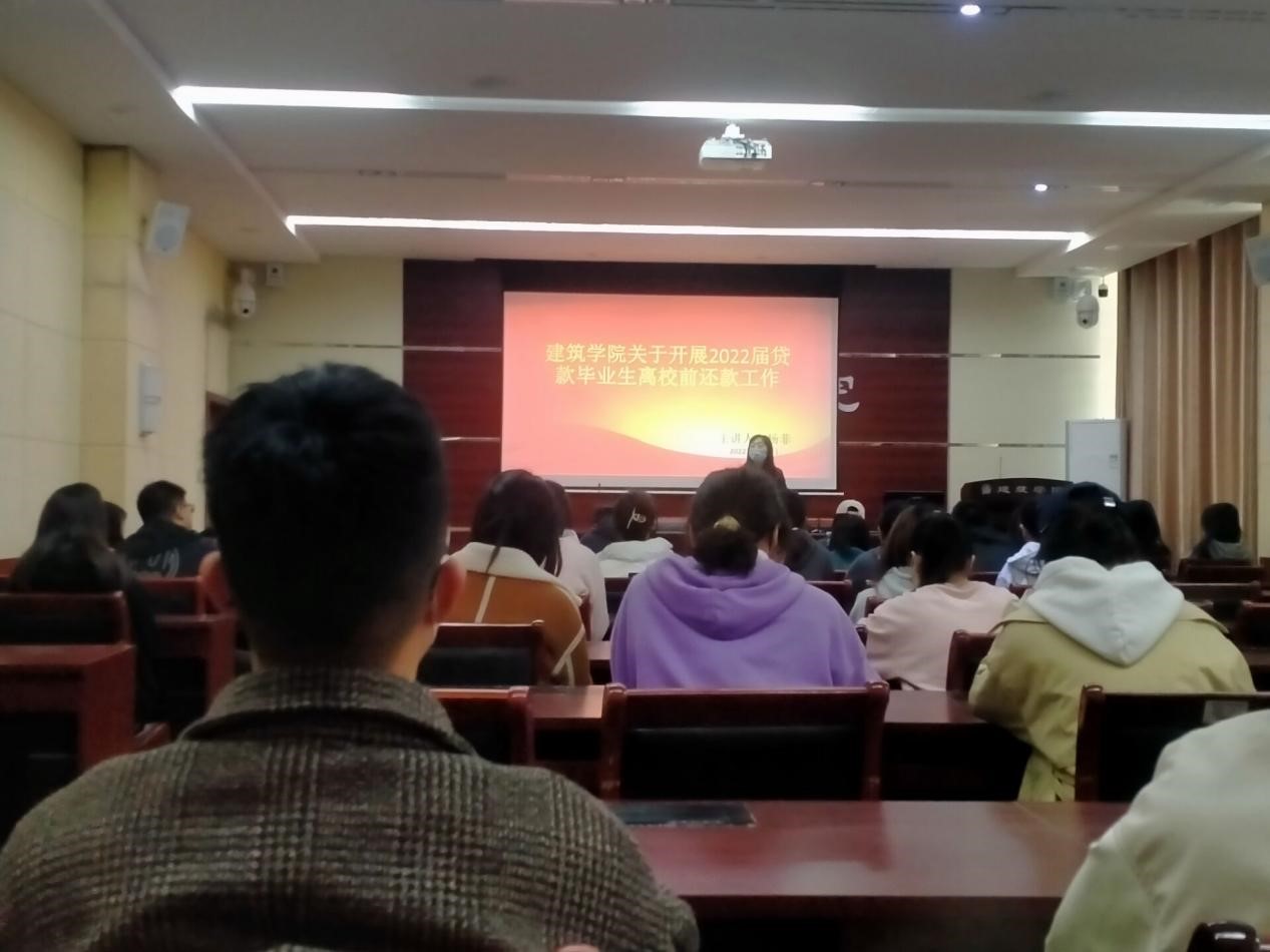 本网讯(学生记者/游晨曦)为进一步做好国家助学贷款的贷后管理工作,优化对贷款毕业生的后续服务,保证学院助学贷款工作的有序开展,4月1日,建筑学院于七教106开展2022届资助政策宣讲会暨贷款还款工作部署会。21级辅导员杨菲老师出席会议并担任主讲人,我院全体贷款毕业生参会。