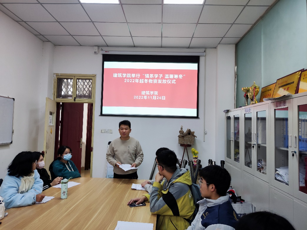 本网讯(学生记者/陈昱晗)为更好地贯彻落实高校家庭经济困难学生资助政策,11月24日,建筑学院于7教118举行“情系学子,温暖寒冬”2022年越冬物资发放仪式。我院资助专干李明东出席活动,12名受助学生到场参加。