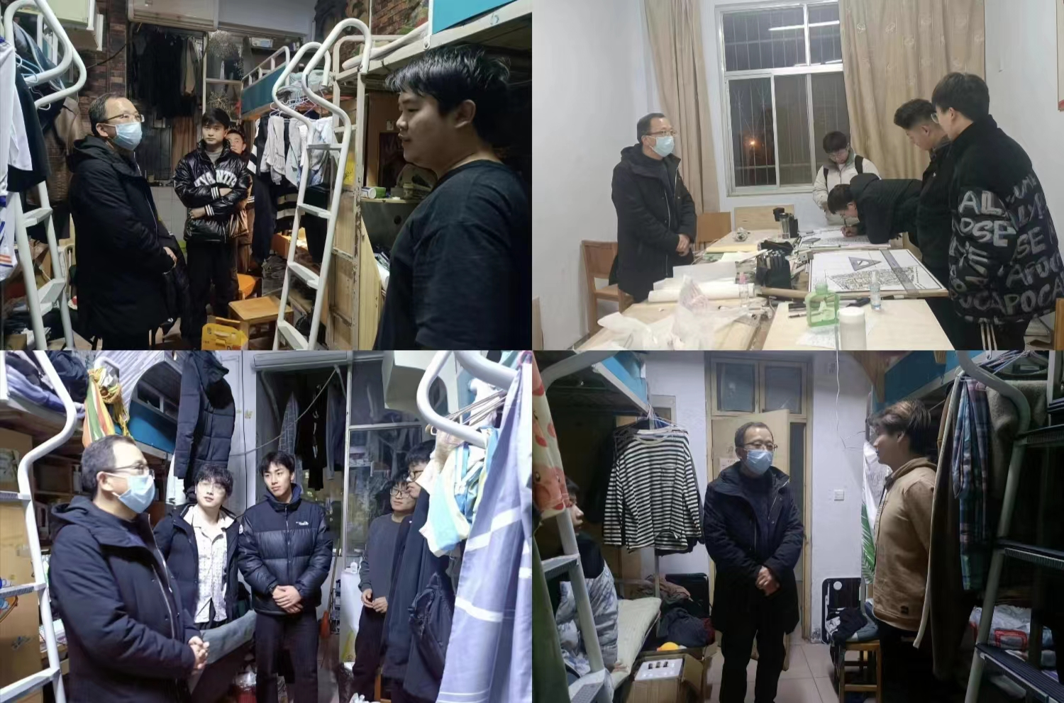 本网讯(记者/田真)为及时了解学生的思想动态及学习生活情况,确保校园疫情防控工作落到实处,11月30日晚,我院党委副书记张辉带领学工队伍深入学生宿舍与专业教室,为同学们送去关心和问候。