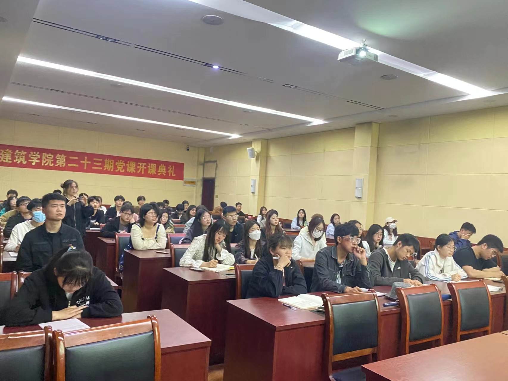 本网讯(学生记者/侯鑫亚)4月10日晚,建筑学院于七教106多功能报告厅举办第二十三期入党积极分子培训班开课典礼暨党课培训第一讲。学院党委书记田光辉、党委副书记张辉、组织委员杨菲及本期入党积极分子参加。