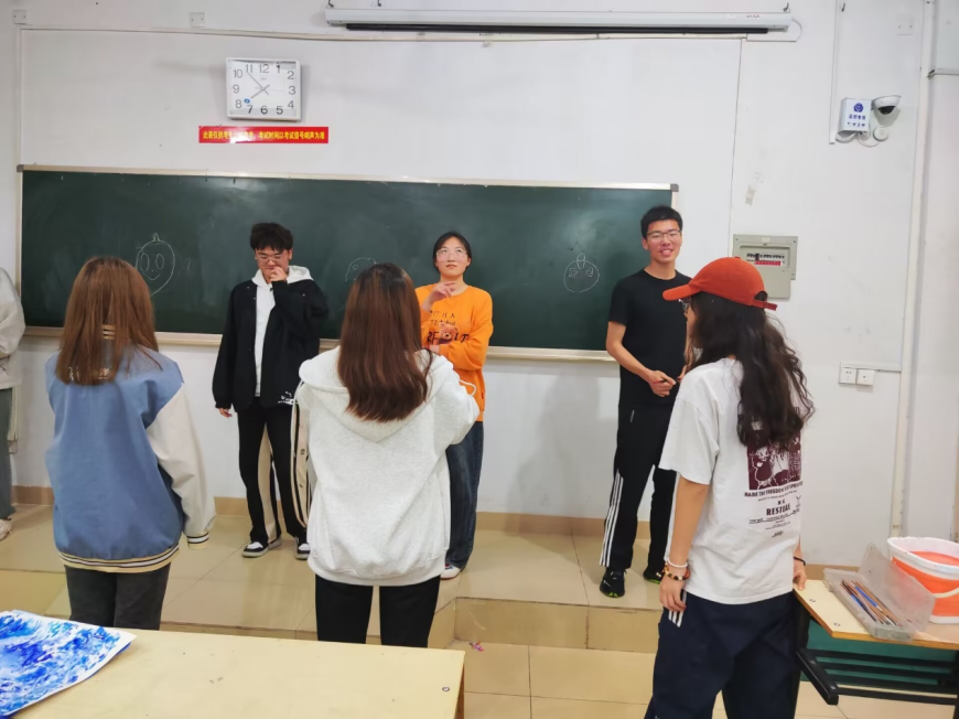 在活动的第一阶段,同学们在了解了“简单蓝”绘画技术的操作方法之后,运用水彩纸和蓝白水粉开始了自由创作。通过在充满治愈力量的蓝色画纸上随心画出心中所想,同学们看到了自身的积极力量,并用心感受到了绘画疗法的心理疗愈作用。