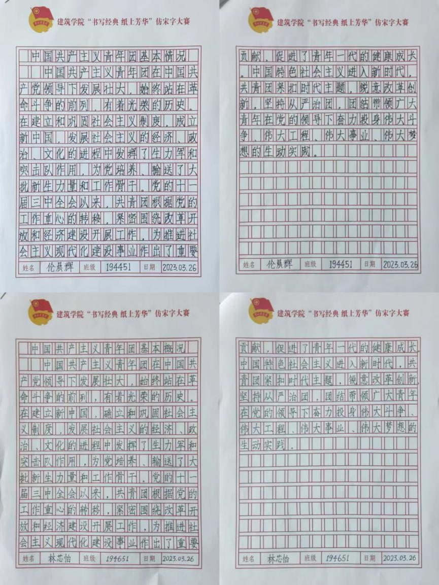 此次仿宋字比赛,旨在继承和弘扬中国共产主义青年团的光荣传统,同时也促进了学生仿宋字书写水平的提高,全面展示了建筑学院学生积极向上、朝气蓬勃的精神风貌。(责编/田真 王晨)