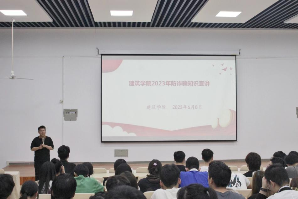 本网讯(学生记者/董贝家)为了进一步增强我院学生的反诈意识,守护学生的财产安全,营造反诈骗的浓厚氛围,6月6日,建筑学院于7教101报告厅举办防诈骗主题活动,22级辅导员李明东老师出席并担任主讲。我院22级全体成员参加。