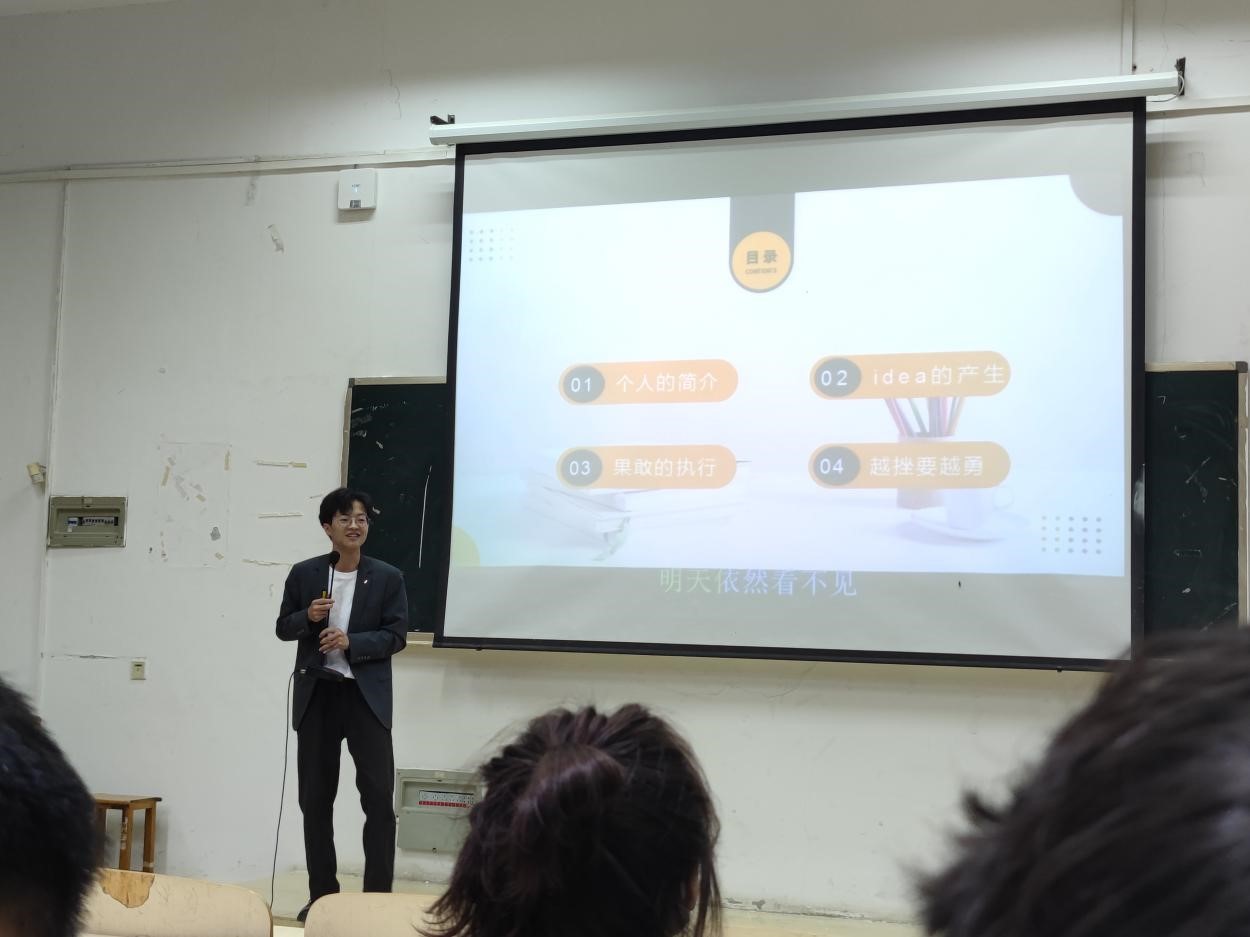 许浩学长向学弟学妹们分享了他大学时期以及毕业至今的创业经验,他表示“要跟随自己的内心,不要过多受周围人的影响,越挫越勇,去赌,去爱,去环游世界,去刀山火海”。同学们认真聆听,积极提问,现场氛围十分活跃。
