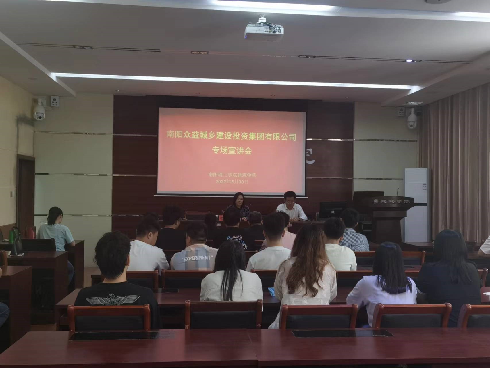 本网讯(记者/牛烨)为更好拓宽毕业生就业渠道,5月30日下午,我院于七教106会议室举办南阳众益城乡建设投资集团有限公司专场宣讲会。本次宣讲会由招聘方两位负责人主讲,我院三十余名学生参加。