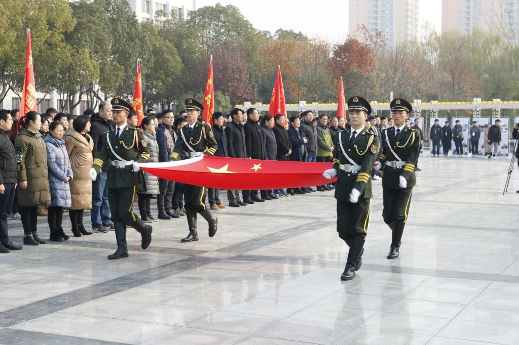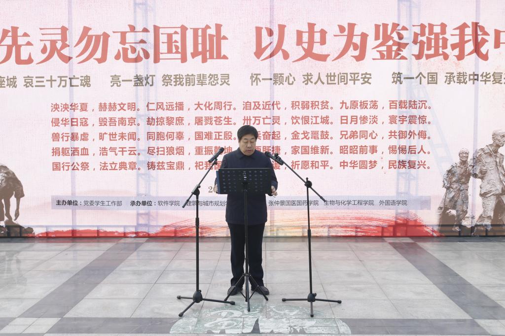 活动伊始,主持人携全体成员奏唱国歌,并为南京大屠杀30万遇难同胞默哀一分钟。随后,肖泽昌校长发表讲话表示:当代大学生要铭记历史,缅怀先灵勿忘国耻,以史为鉴强我中华,要有振兴中华的使命和担当。紧接着学生代表演讲:“身为当代青年人不应该忘记我们革命先辈艰苦奋斗的岁月。不忘国殇,才能时刻警醒自己,作为青年人应该为国家的伟大复兴和建设献出自己的青春与力量。”最后,国旗护卫队护旗入场,主持人领誓,全体人员庄严宣誓:“铭记历史、勿忘国耻,从我做起,努力学习……”激昂的宣誓声在广场上方久久回荡。