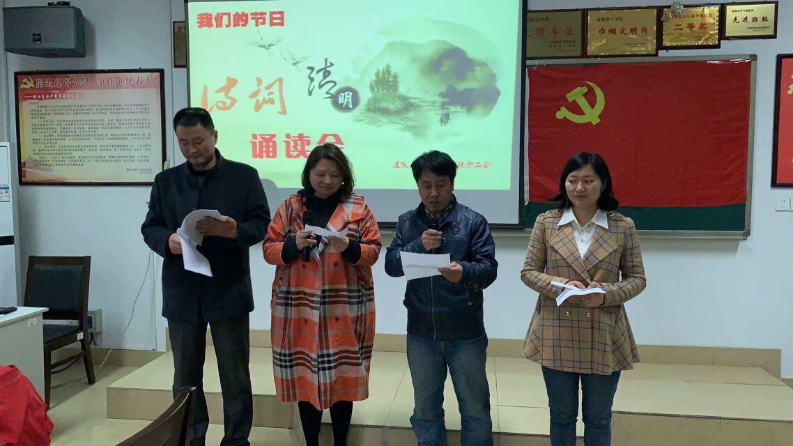 4月2日下午,建筑与城市规划学院分工会在13218举行“不负好春光——清明节诗歌朗诵会”活动。朗诵会在学院三位领导激情昂扬的《腾飞吧,祖国》中拉开帷幕。《清明》《忆江南》《清明的记忆》《绝句》《有的人》《怀念雷锋》……各位朗读者用诗歌吟诵的形式表达了对革命先贤的崇高敬意、对古代先贤的深切缅怀、对如画春光的细致描摹、对美好生活的深情歌颂,让全院教工在领略诗歌朗诵艺术之美的同时,进一步深刻认识到文明祭祀的重要意义。更进一步唤醒潜藏在我们血脉中的传统文化基因,树立文化自信。整场活动,充满诗情画意的音乐中拉开序幕,展现了南阳理工学院美好的清明时光。