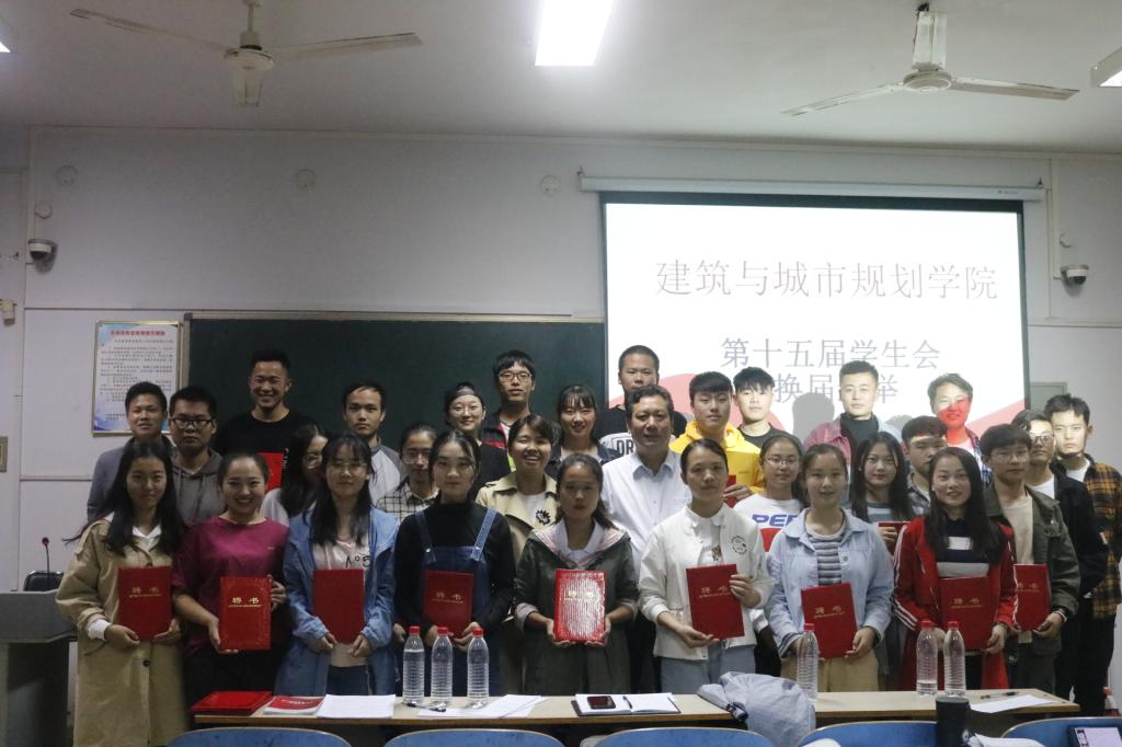 10月12日晚,建筑与城市规划学院于13号楼603教室举办第十五届学生会换届活动。党委书记陈博、团学办主任杜鹤出席,第十四届学生会成员及第十五届学生会新成员参加本次活动。