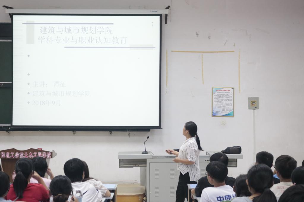 9月12日,建筑与城市规划学院于5阶一教室开展新生教育工程之三“学科专业与职业认知教育”,该院副院长谭征担任此次主讲,全体18级新生聆听学习。