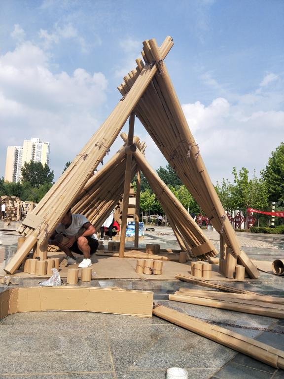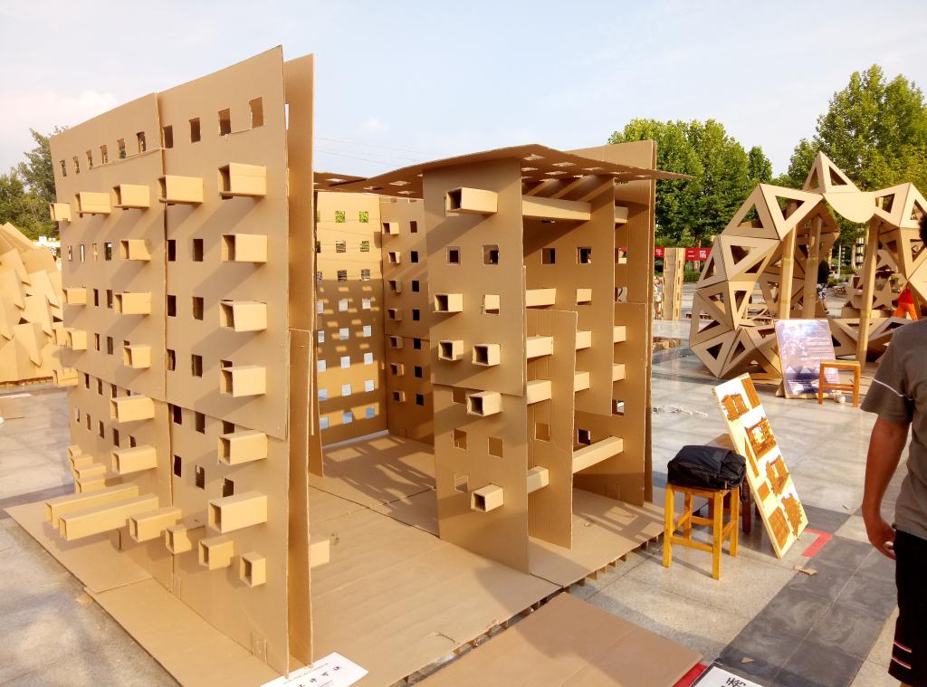 上午8时大赛开始,各参赛队开始模型制作。一块又一块的纸板在同学们的手中切割,拼接,向着预定的目标变化着形状。经过8小时现场连续作业,各参赛队队员顶着酷暑,34栋形态不一、各具创意的瓦楞纸板建筑,在一支支参赛队手中渐渐成形,成排耸立于南阳理工学院齐贤广场,蔚为壮观。
