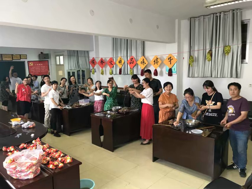 本次活动分为端午文化讲堂和包粽子比赛两部分。歌声中老师和同学们追古溯今一同观看了关于端午节由来的视频,并分享了各自家乡的端午趣闻。随后,各教研室代表老师颂端午诗词,致敬佳节。并以教研室、办公室为单位进行端午知识竞赛。