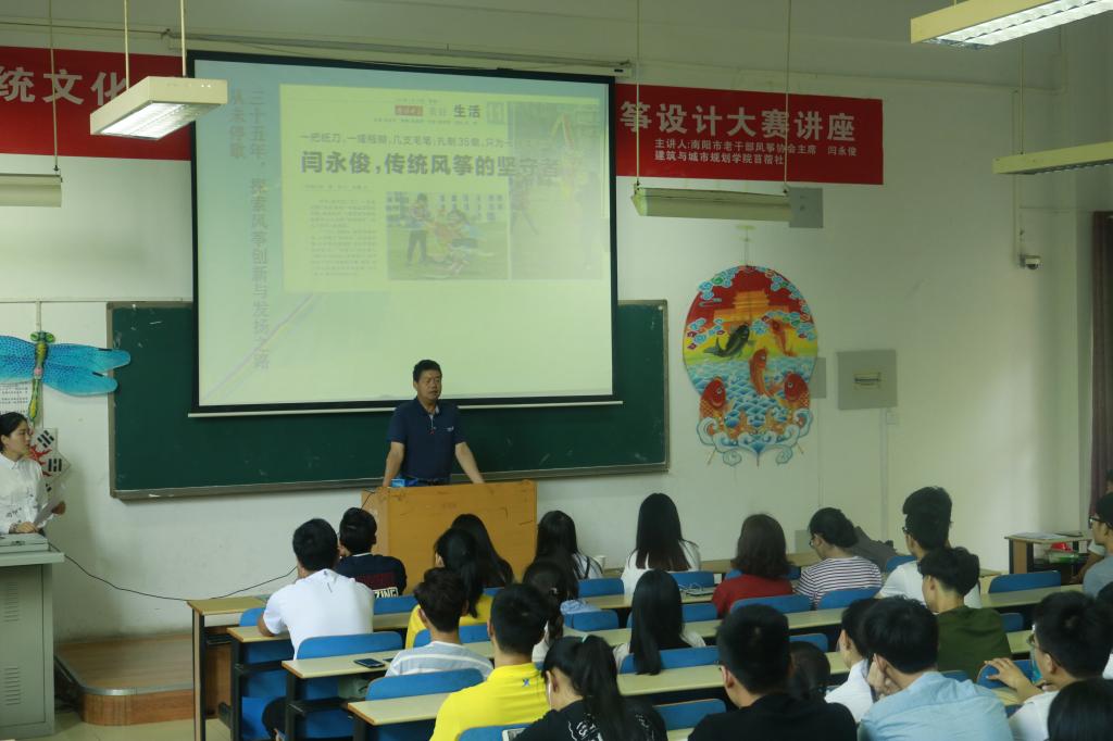5月13日,建筑与城市规划学院于14教106教室举办了“秉承传统,放飞公益之爱”风筝制作讲座,主讲人为南阳老干部协会主席闫永俊,苜蓿社200余名风筝爱好者聆听了本次讲座。