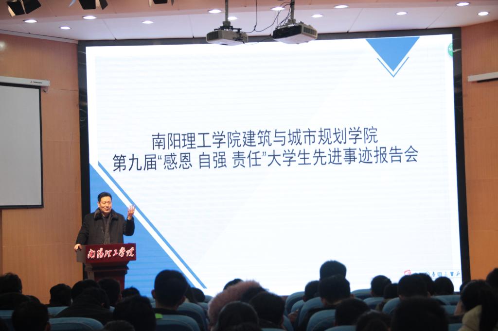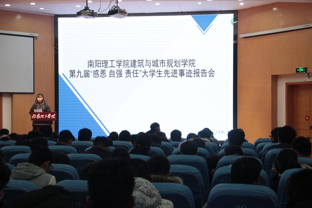 建筑与城市规划学院于12月14日在领创空间二楼报告厅举行第九届“感恩、自强、责任”大学生先进事迹报告会。出席本次报告会的有党委书记陈博,辅导员杨菲;16、17级全体学生聆听本次报告会。