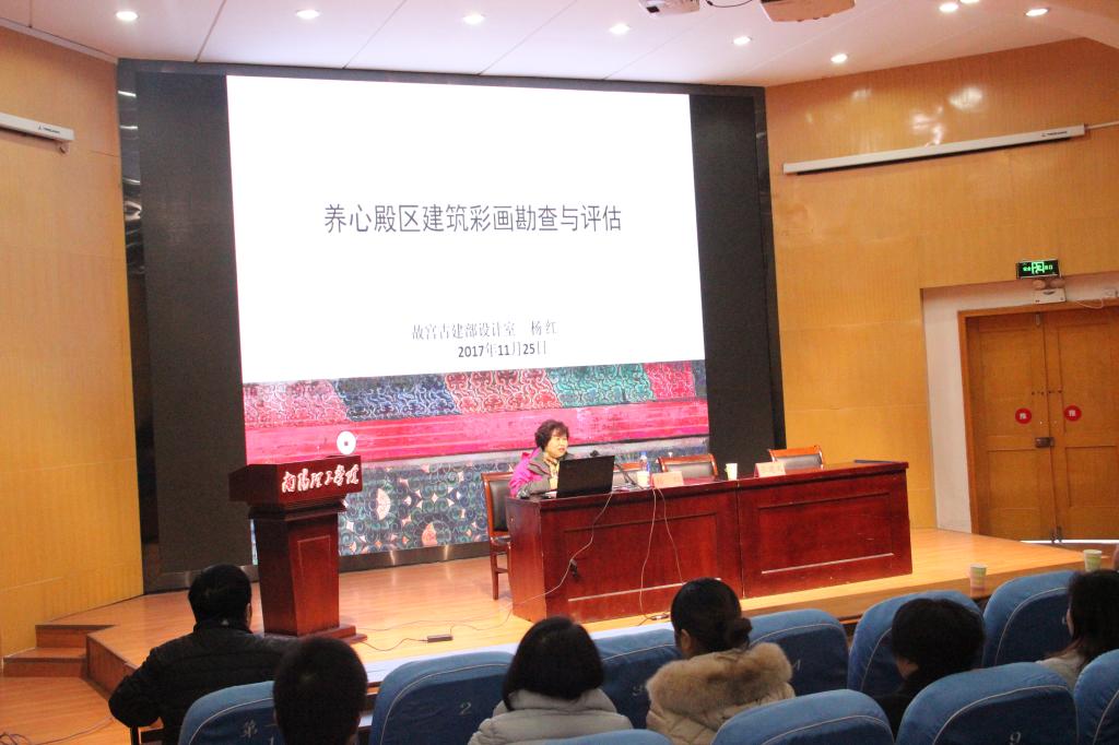 杨老师是故宫博物院高级工程师,主持和参与了国家级和文化部诸多研究课题。本次讲座以“养心殿研究性保护项目”为背景,详细介绍了彩画勘察、评估的流程和方法,建筑在不同历史时期彩画反映的不同特点、历史遗迹和表现的问题及研究方法。讲座不仅丰富了同学们彩画方面的专业知识,更是启迪了学生们在研究过程中应具有科学严谨的求实态度和追根求源的研究精神。最后,杨老师还指出了学院今后在河南彩画方面工作的努力方向,为师生在实践教学方面提供了很好的建议和意见。