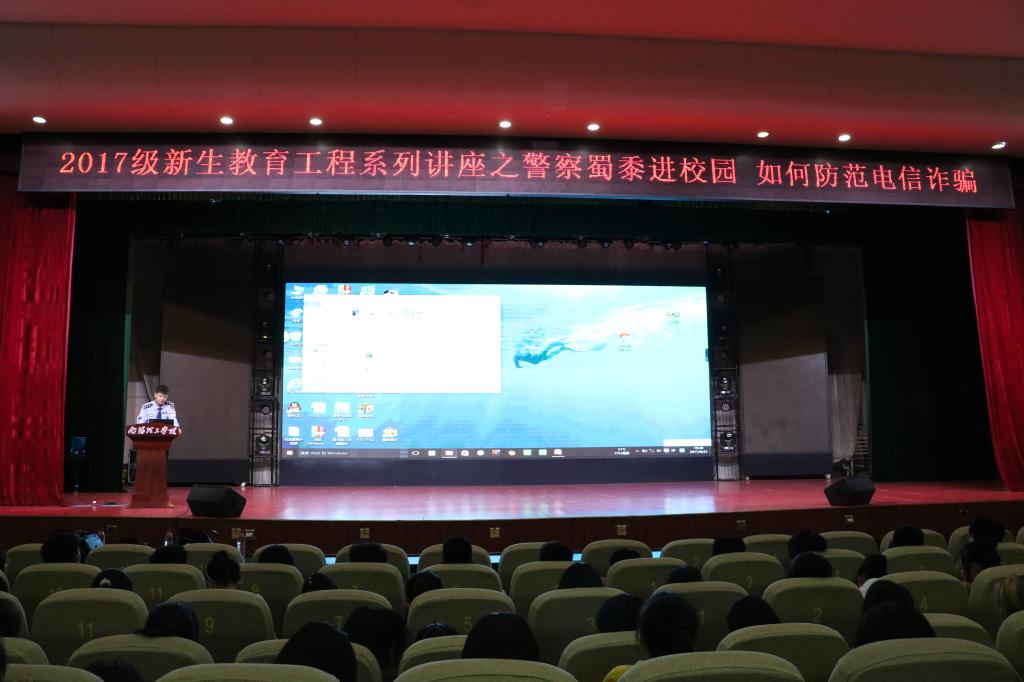 针对高校开学季诈骗案件多发的情况,为了提高我院新生对电信诈骗的辨别和防范能力。9月24号晚,应建筑与城市规划学院的邀请,南阳市公安局反虚假信息诈骗中心副大队长付聪警官来到我校,在毕业大厅为建筑、音乐、国医、文法四个学院600余位2017级新生做了一场“如何防范电信诈骗”的安全讲座,各相关学院老师参于其中。