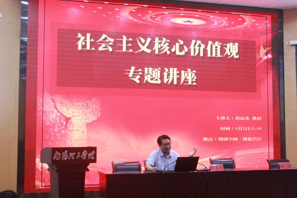 本网讯(特约记者 杨菲 廖倚琴)6月1日,我院邀请校政治理论教学部主任葛晨光教授在领创空间二楼报告厅开展社会主义核心价值观专题讲座。学院全体领导班子及300余名师生参加,讲座由党委书记陈博主持。