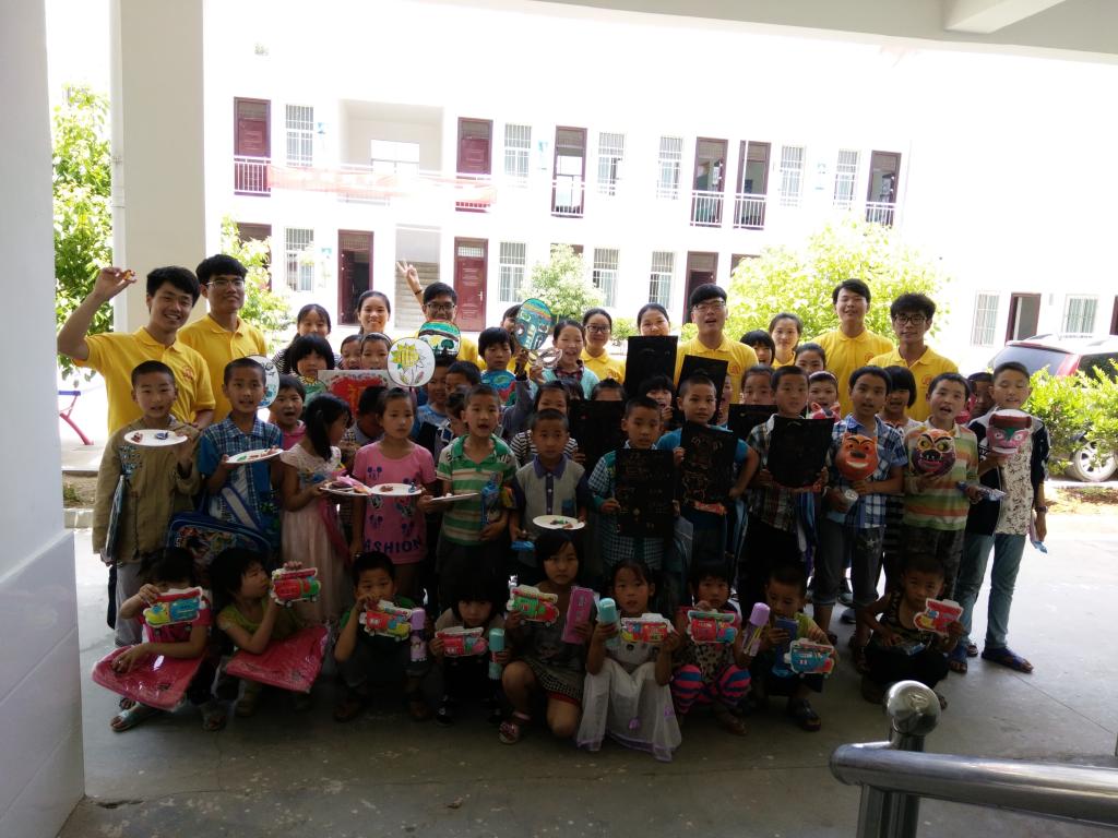 本次活动主要根据学院专业特点,以普通话的普及、美术绘画的入门、手工制作等多种形式进行。到达小学时,正值课间操时间,志愿者们进入学生的队伍中与他们一同锻炼。一曲《少年强》响彻校园,学生们整齐的步调、响亮的口号感染着大家。在课间操结束后,一场志愿者与小学生之间的乒乓球比拼也拉开帷幕,你来我往之间,欢声笑语在整个校园回荡。本次活动我院志愿者携带了包括手绘面具、团扇、软陶等在内的手工材料,分组担任各个教学班的“助教”,以活动课和教育课的形式给同学们带去欢乐。经了解这些孩子大部分都是留守儿童,父母都在外地打工,孩子不愿与陌生人多说话,心理有些自闭,实践队员们协助带队老师耐心地与孩子交流谈心,帮助他们克服心理障碍,引导他们走向健康的成长道路。时间如白驹过隙,和孩子们在一起的时间总是那么短暂,本次支教也进入尾声,我院志愿者从学生们的作品中挑选出优秀作品赠送书包、彩笔等奖品并合影留念。