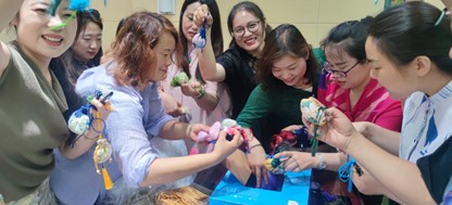 活动现场,老师们在轻松的氛围下,边包粽子边交流着端午节的由来及相关习俗。有的老师技术娴熟,一片片清香的粽叶、一粒粒晶莹的糯米,在他们的巧手下转眼就变成了一个个诱人的粽子;有的老师现学现包,好不容易包好了粽叶,糯米又漏了出来,现场充满了欢声笑语……摸盲盒抽香囊环节更是将活动推向了高潮,让老师们切身感受到了端午节浓浓的节日气氛。