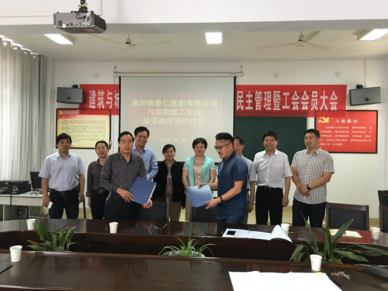 5月23日,南阳隆泰仁医药有限公司与南阳理工学院在建筑与城市规划学院会议室举行捐资助学签约仪式。南阳隆泰仁医药有限公司董事长郭学义、中泰医圣堂馆长包飞建、南阳理工学院副校长张铟、以及我校建筑与城市规划学院、张仲景国医学院、计算机与信息工程学院、校企合作、教育发展基金相关负责人出席了签约仪式。