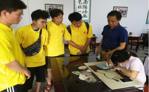 图为建筑学院传承非遗实践队在南阳市烙画厂领略烙画艺术的精美