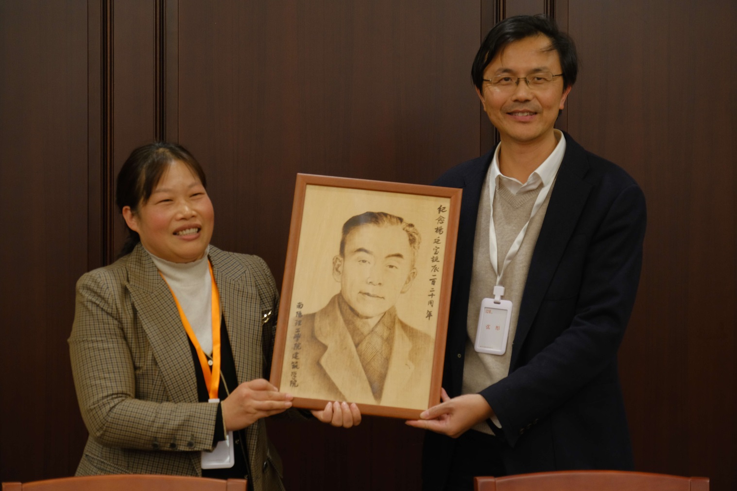 11月20日上午,“杨廷宝先生诞辰120周年学术论坛”在东南大学四牌楼校区大礼堂举行,论坛由东南大学建筑学院院长张彤主持,相关省市领导和学界、业界的院士和专家,以及杨先生家属和杨家友人,以及校友代表等现场出席活动。20日下午,谭征院长和王巍博士参加了“杨廷宝——一位建筑师和他的世纪”展览开幕式以及“杨廷宝学术思想与当代建筑教育研讨会”。研讨会上,谭征院长发言并向东南大学建筑学院赠送了杨廷宝的烙画像。谭征表示,南阳是杨廷宝先生的家乡,南阳理工学院建筑学院会秉承老一辈的建筑教育理念,让杨先生的精神在家乡生根发芽,实现他对家乡的期望,同时会培养更多的应用型人才,为服务地方城乡建设贡献更大力量。