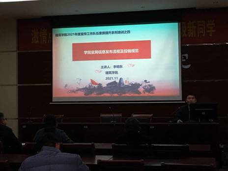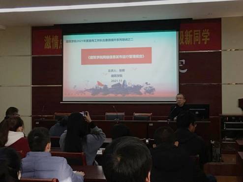 (通讯员 田真)为进一步加强意识形态阵地管理,严防网络信息传播安全事故,促进学院新闻宣传工作良性发展,11月29日至30日,建筑学院举办2021年度宣传工作队伍素质提升系列培训。学院党委领导班子、科级干部、学院网站管理员及宣传部全体部员参与培训。