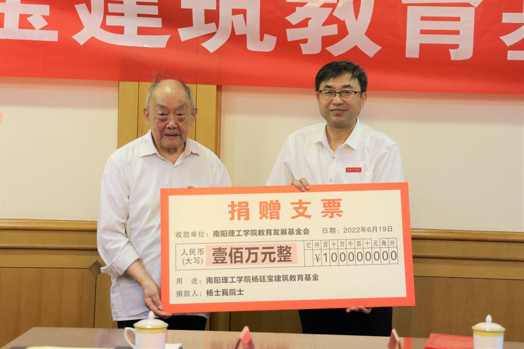在纪念杨廷宝先生返乡四十年学术论坛成功举办之际,杨士莪院士向我校捐赠100万元,并以父亲杨廷宝的名义设立“杨廷宝建筑教育基金”,用于支持南阳理工学院建筑学院学科发展。该项基金将主要用于资助贫困学生、奖励优秀学子和开展学科竞赛等,将杨廷宝先生对家乡教育事业关心关爱的情怀延续下去。