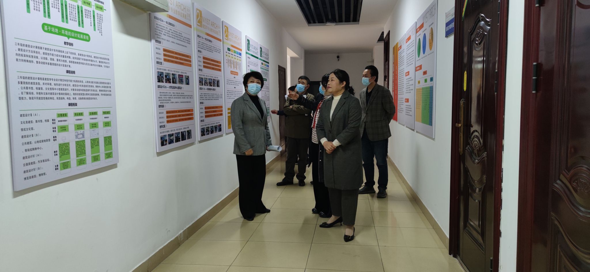 建筑学院院长谭征首先汇报了建筑学专业评估准备工作进展,并带领高校长一行重点对学院楼前广场、专业教室、教学走廊、门厅等改造升级情况进行实地查看。