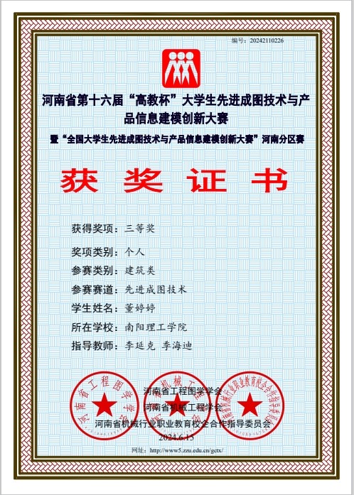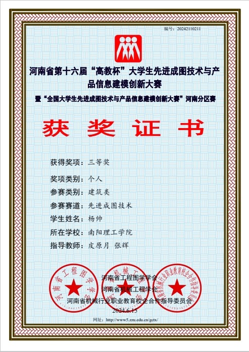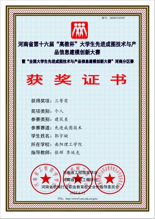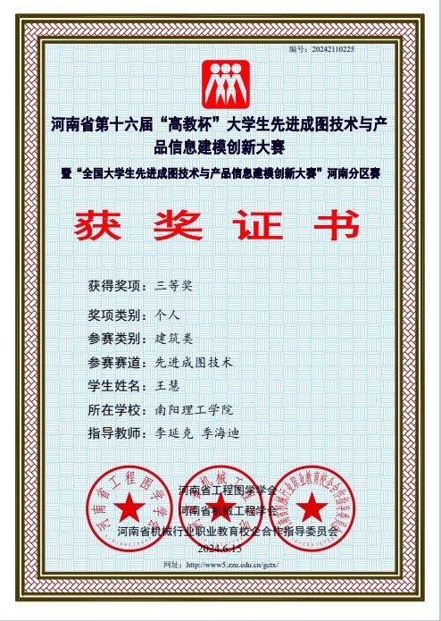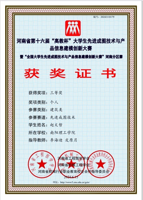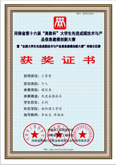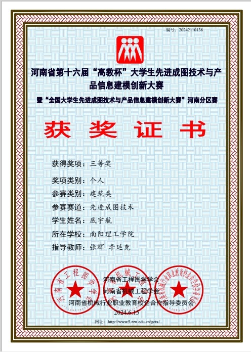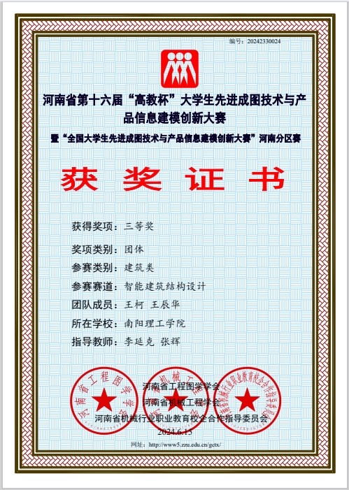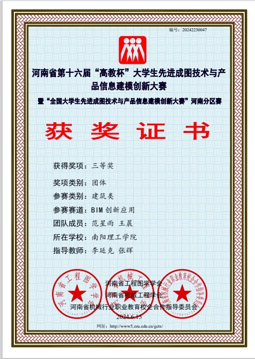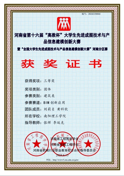 本网讯(记者/李延克)5月24日至5月25日,河南省第十六届“高教杯”大学生先进成图技术与产品信息建模创新大赛于线上举行。经过激烈角逐,土木学院与建筑学院参赛队伍荣获建筑类团体一等奖,荣获建筑类BIM创新类三等奖3项;建筑类智能建筑结构设计三等奖1项;建筑类先进成图技术一等奖1项,二等奖3项,三等奖12项。